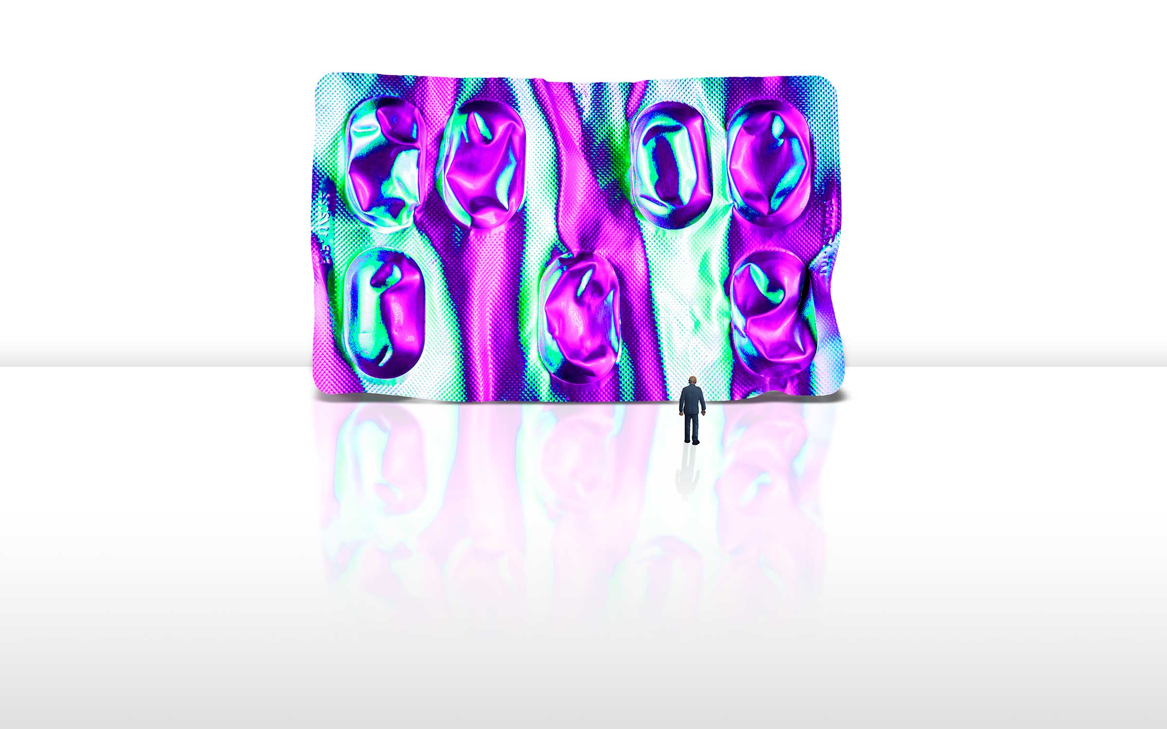 Doch hat diese schöne neue Welt eine Kehrseite. Dorian Recker ist Kardiologe und kennt sie aus seiner ärztlichen Praxis: Jährlich landen tonnenweise Medikamente im Abfall. Medikamente, die einen materiellen Gegenwert von mehreren Milliarden Euro darstellen. Dies geschieht, weil die Abpackungen in ihren Größen ungünstig sind. Ungünstig für den Verbraucher – finanziell günstig für Pharmaindustrie und Krankenkassen. Es geschieht, weil Menschen ihre Medikamente dann doch nicht einnehmen und sie verfallen lassen. In Sachen Pharmamüll ist es nicht anders als in vielen anderen Bereichen unserer westlichen Gesellschaften, die sich zu Konsum- und Wegwerfgesellschaften entwickelt haben. Man denke an die Bekleidungs- und Lebensmittelindustrie. In seiner beruflichen Arbeit dem Thema Pharmamüll sehr nahekommend, erhält und sammelt Dorian Recker aus der eigenen Praxis und der Apotheke Blisterverpackungen und lose Tabletten – in den seltensten Fällen sind die Medikamente abgelaufen. Mit diesem Material, das er durch Baumaterialien ergänzt, beginnt er zu bauen. Und schon wieder kommt der Begriff der schönen neuen Welt in den Sinn: Recker entwirft leuchtend bunte Blumenwiesen, Strände mit Surfern, eine goldene Plattform im All, einen neuempfundene romantischen „Wanderer über dem Blistermeer“ in Anlehnung an Caspar David Friedrich.